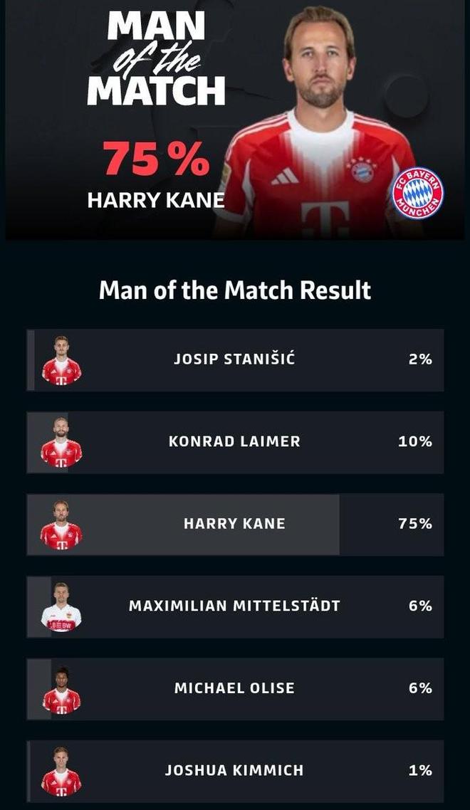 德甲第13轮,拜仁客场5-0大胜斯图加特,此役替补登场上演帽子戏法的凯恩当选德甲官方全场最佳球员。